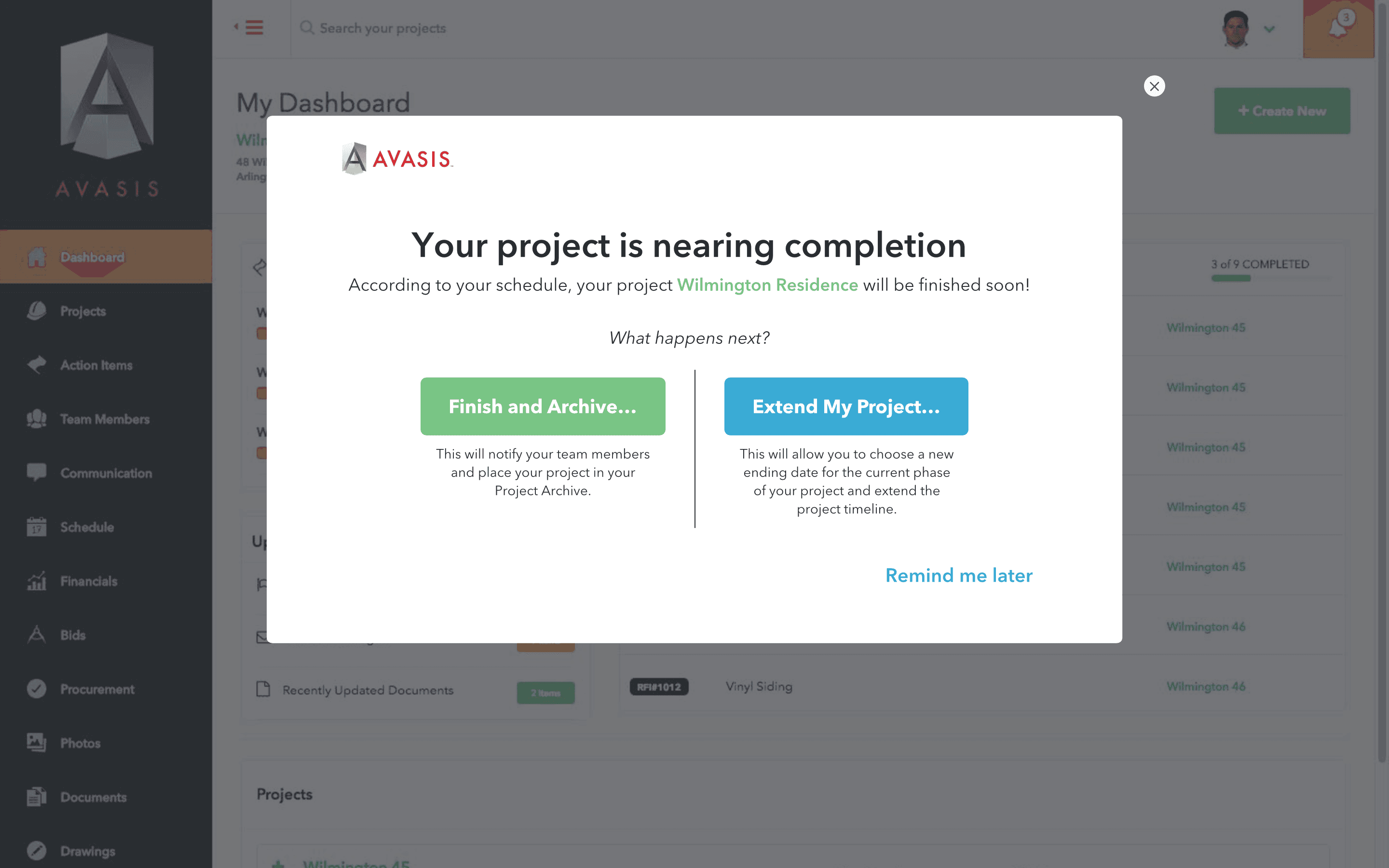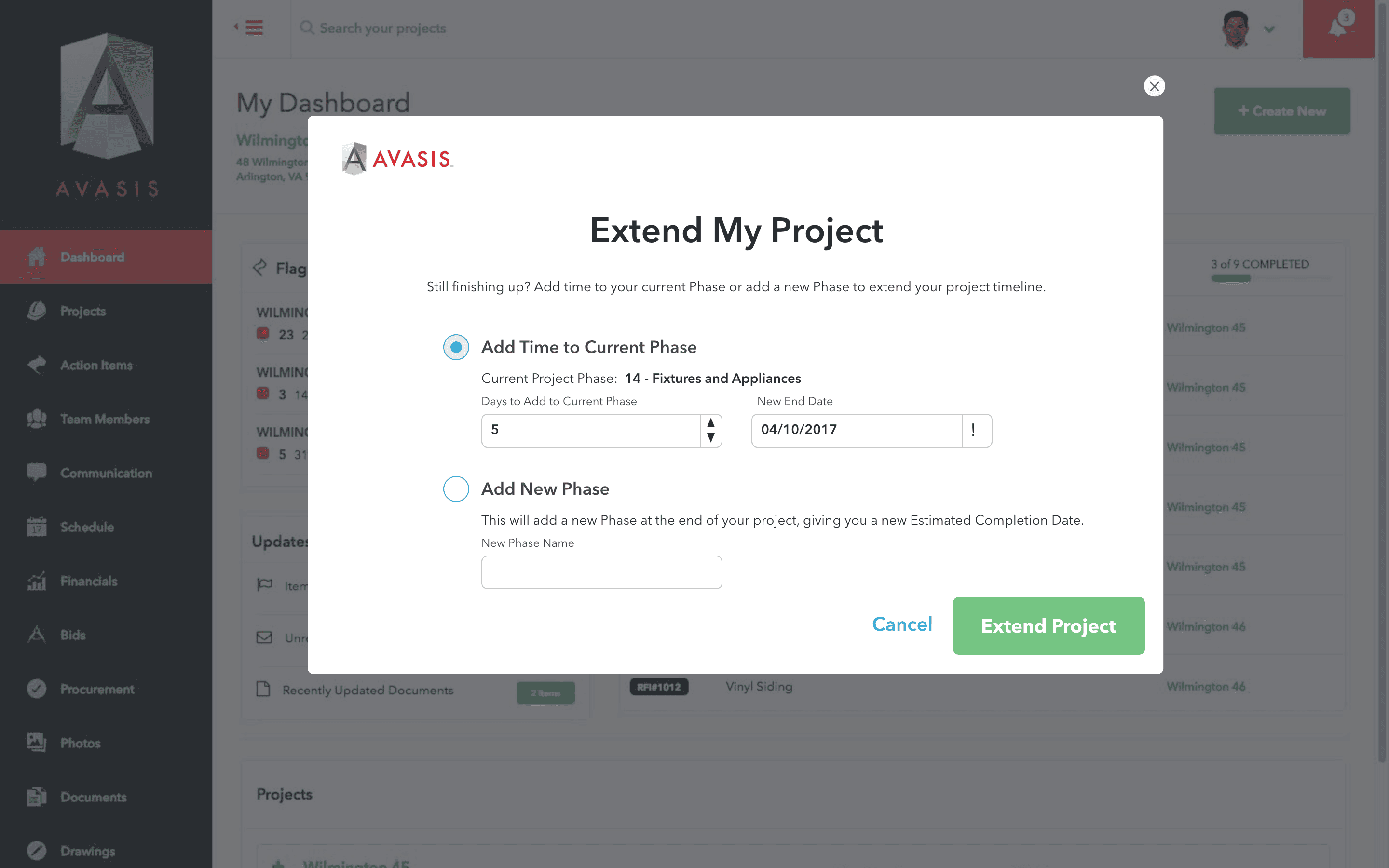 When a build nears its scheduled completion, the manager has the option to mark the project complete (which will archive the project and prepare final documentation), or extend the timeline. If the project is extended, the manager enters a new completion date which will update all of the remaining dates in the project.