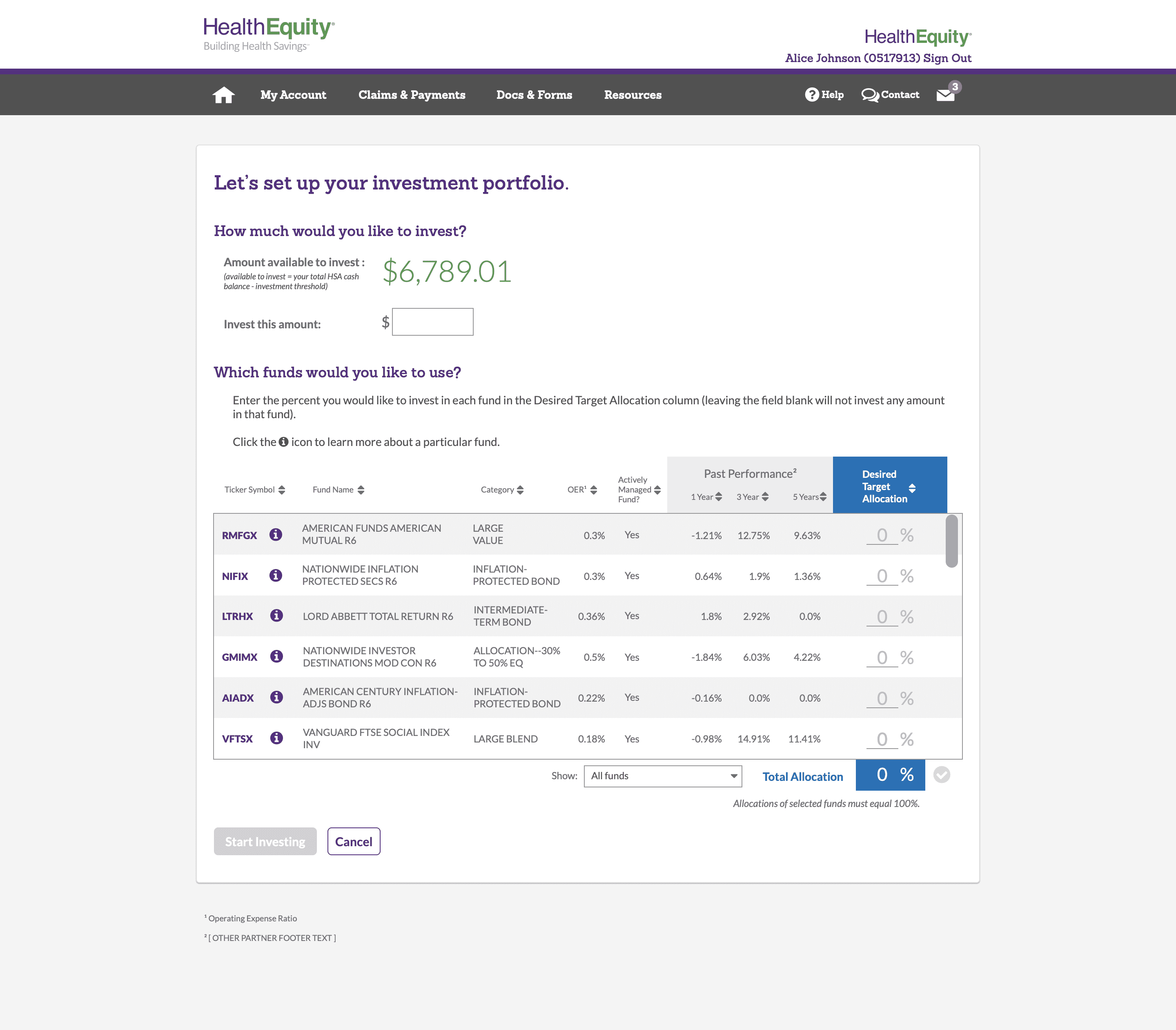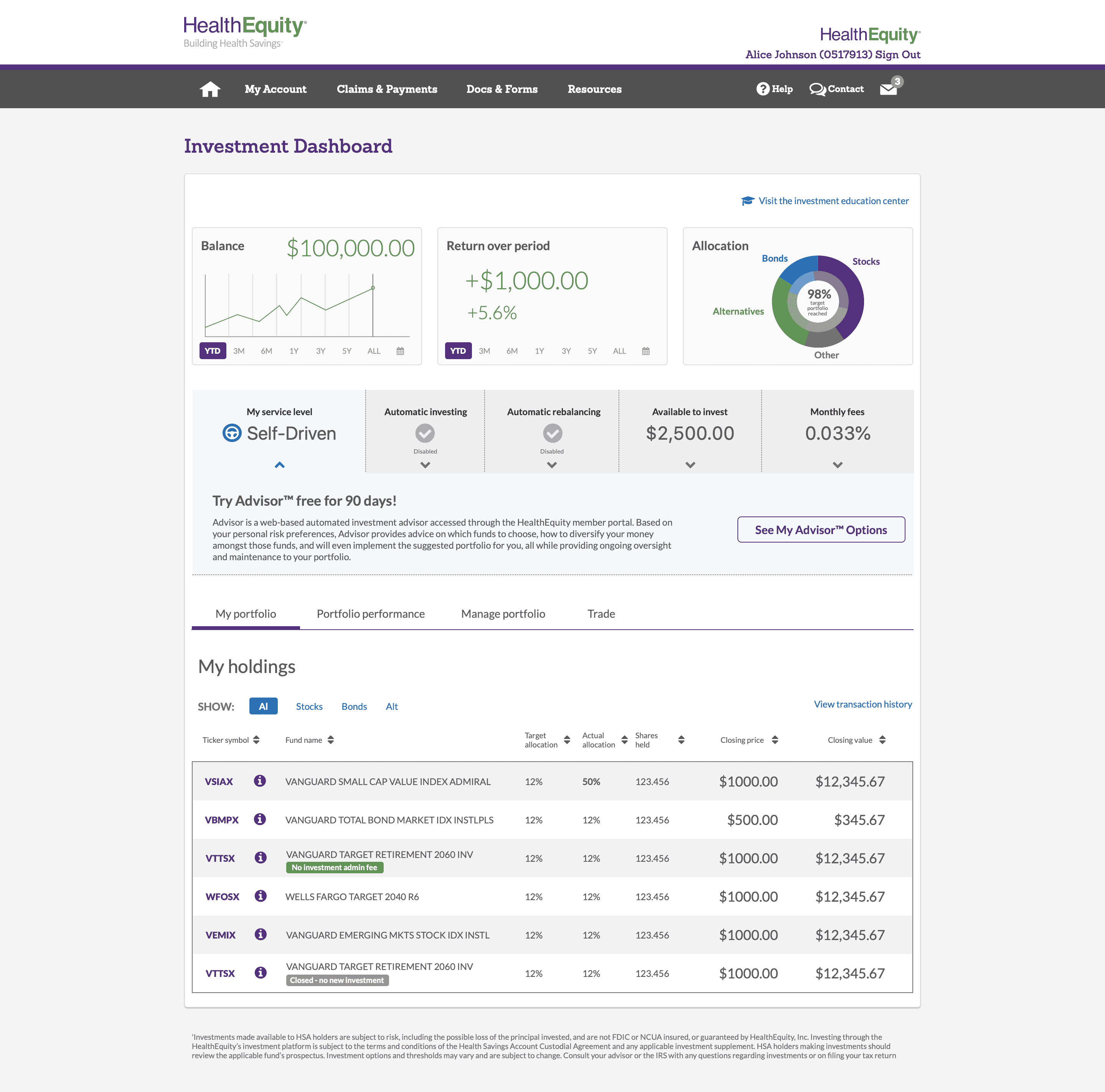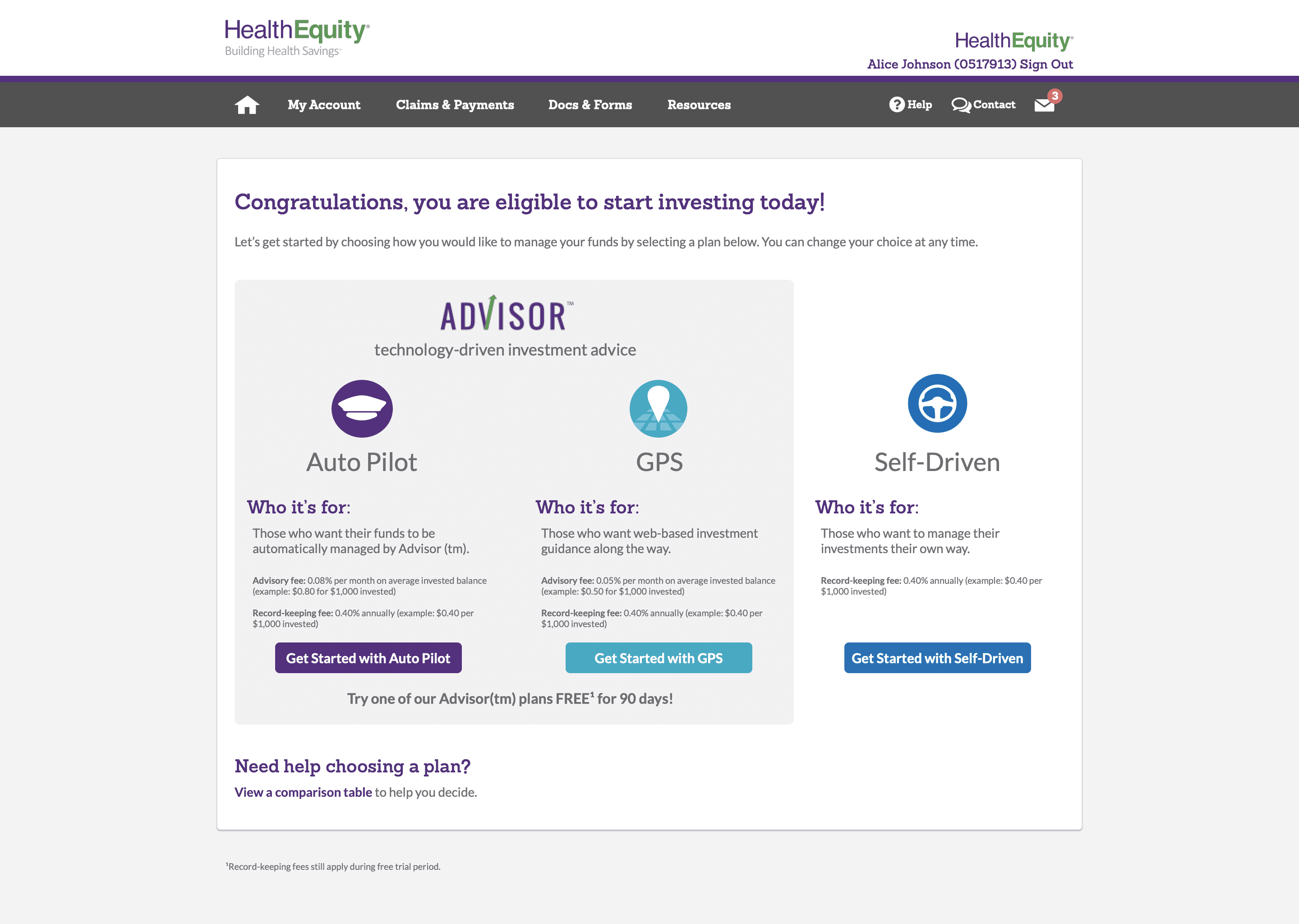 HealthEquity is a health-benefits company that manages health savings accounts (HSAs), flexible spending accounts (FSAs), and other types of reimbursement accounts. After member account holders have accumulated a certain amount of savings in their HSA, they can invest the excess in an assortment of mutual funds. At the time this was advertised to the member when it initially rolled out, and a reminder lives on their dashboard, where investing is a top-level page navigation item.